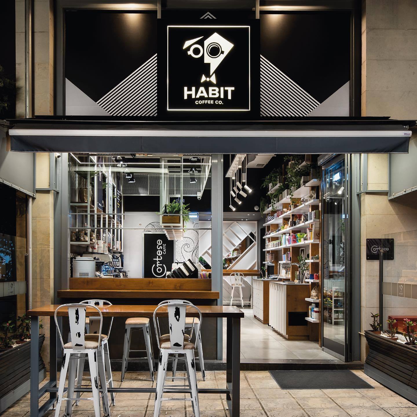 Habit Coffee Co. Ένα street coffee που εκτός από διαφορετικές ποικιλίες καφέ προς κατανάλωση, έχει και αξεσουάρ καφέ για τον home barista, διάφορες ποικιλίες τσαγιού και αξεσουάρ για τους tea lovers. Ωραία inimal διακόσμηση, μεγάλα χαμόγελα, υπηρεσίες delivery στο χώρο σας και εφαρμογή – application για iOS & Google Play (για delivery).